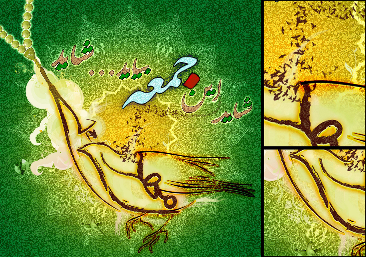 اگه دقت كني ميبيني كه قسمت انتهاي تصبيح به يا مهدي چسبيده شده يعني نقش همون ريسه هاي تسبيح را بازي ميكنه!(اين دليل استفاده از تسبيح)...در مورد نقطه ها هم حق با شماست توي قسمت تايپوگرافي خوب كار نكردم. در مورد 3 تيكه شدن كار بايد بگم سايز اصلي 1200*1600 با رزوليشن 300dpi بود كه قابليت زوم را داشت به دليل كشش كم خطوط مجبور شدم كار را با كيفيت و سايز كمتري قرار بدم.